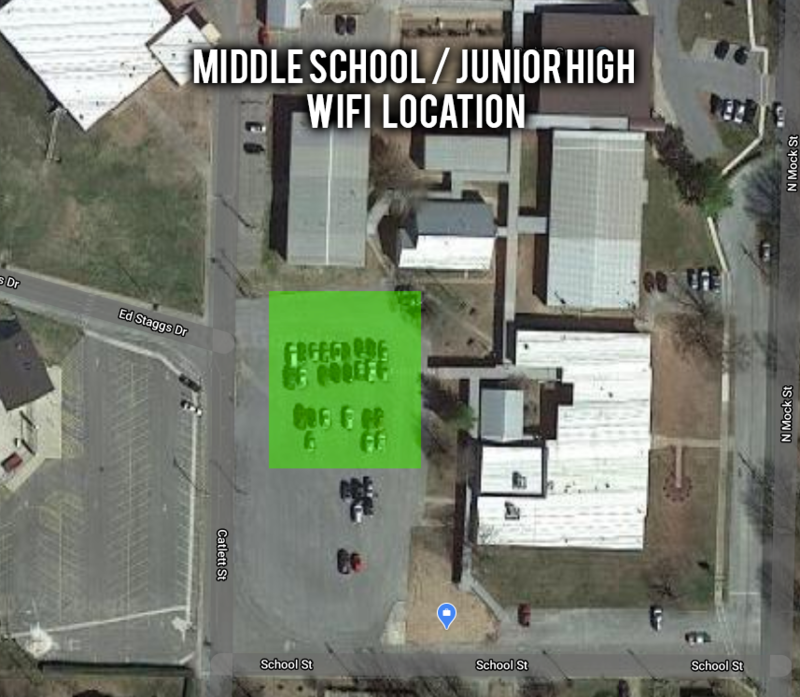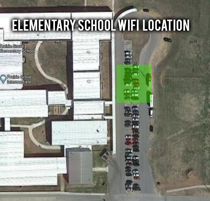 Prairie Grove Schools and PGTelco are providing free Wi-Fi hotspots for students during the school closure due to COVID-19. PGTelco hotspots are located at the PG Aquatic Park and the Town Center. Prairie Grove Schools have hotspots located at the high school, middle school, and elementary school parking lots. The school Wi-Fi hotspots will be active from 6:00 am to 10:00 pm, daily. Please refer to the map below to find the best wireless signal to access the school hotspots. Please remember to practice proper social distancing when using these Wi-Fi hotspots.